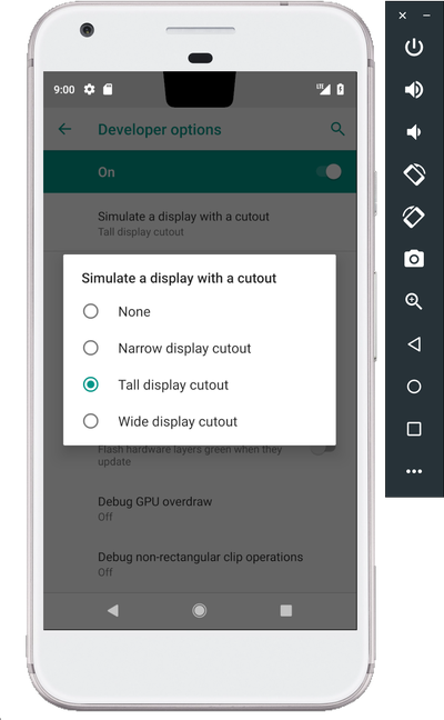 - Υποστήριξη για notch. Οι προγραμματιστές μπορούν να προσομοιώσουν το notch στη συσκευή τους έτσι ώστε να βελτιώσουν τις εφαρμογές τους – μάλιστα υπάρχουν διάφορα μεγέθη, από το μεγάλο του iPhone X ως το μικρό του Essential Phone.
