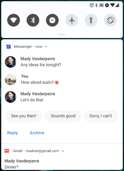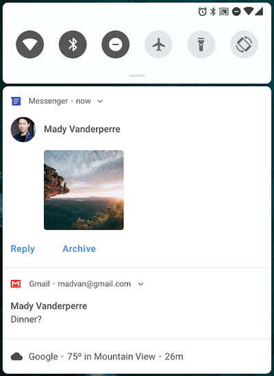 - Βελτιωμένο κέντρο ειδοποιήσεων. Οι χρήστες θα μπορούν να απαντήσουν κατευθείαν σε ένα μήνυμα από την ειδοποίηση και μάλιστα θα υπάρχουν προτεινόμενες έξυπνες απαντήσεις όπως στις εφαρμογές μηνυμάτων της Google, ενώ οι ειδοποιήσεις θα μπορούν να εμφανίζουν περισσότερες πληροφορίες, όπως avatars, συζητήσεις και φωτογραφίες.