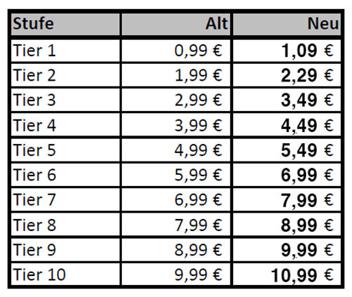 Η Apple άλλαξε την τιμολογιακή πολιτική του App Store των φορητών συσκευών της, και πλέον επιτρέπει στους προγραμματιστές να πουλάνε εφαρμογές με ελάχιστη τιμή τα €0,49. Παράλληλα, η Αμερικάνικη εταιρία αύξησε τις τιμές των υπόλοιπων βαθμίδων τιμολόγησης. Η τιμή της δεύτερης βαθμίδας τιμολόγησης, και ίσως της πιο σημαντικής, ανέβηκε κατά 10 λεπτά του ευρώ, δηλαδή από €0,99 που κόστιζαν μέχρι σήμερα οι φθηνότερες εφαρμογές, πλέον θα κοστίζουν €1,09. Η τρίτη ανέβηκε από €1,99 σε €2,29. Οι συγκεκριμένες αλλαγές εφαρμόστηκαν στο App Store, επομένως σύντομα θα μπορείτε να ψωνίζετε εφαρμογές και παιχνίδια του μισού ευρώ. Ένα από τα πρώτα παιχνίδια που προσαρμόστηκαν είναι το “Hitman Sniper” που πλέον κοστίζει €0,49.