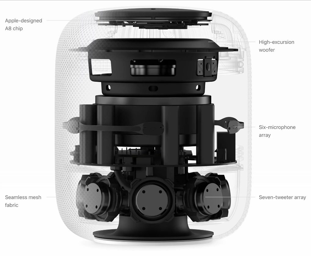 Το Apple HomePod έχει ύψος 17 εκατοστά. Μέσα του, στο κάτω μέρος, υπάρχουν επτά συστοιχίες tweeter και ένα woofer 4 ιντσών με auto bass EQ σχεδιασμένο από την Apple. Έξι μικρόφωνα τριγύρω από τη συσκευή είναι πάντα ανοιχτά για να ακούνε στην εντολή “Hey Siri” που ενεργοποιούν την ψηφιακή βοηθό. Αξίζει να σημειώσουμε ότι μέχρι να πείτε την εντολή τίποτα δεν στέλνεται στους servers της εταιρίας για να μην υπάρχουν θέματα με την ιδιωτικότητα των χρηστών, ενώ όταν ρωτήσετε κάτι τη Siri χρησιμοποιείται ένα ανώνυμο ID για την επεξεργασία του αιτήματος. Επίσης, τα μικρόφωνα μπορούν να ακούν τον χρήστη ακόμα και όταν βρίσκεται στην άλλη μεριά του δωματίου και παίζει δυνατή μουσική.