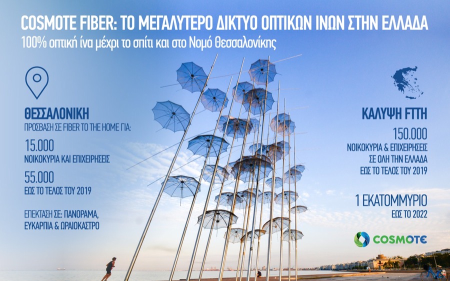 Τις απεριόριστες δυνατότητες των οπτικών ινών μέχρι το σπίτι φέρνει στο νομό Θεσσαλονίκης ο Όμιλος ΟΤΕ. Μέσω του COSMOTE Fiber, του μεγαλύτερου δικτύου οπτικών ινών στην Ελλάδα, 15.000 νοικοκυριά και επιχειρήσεις σε περιοχές των δήμων Θεσσαλονίκης και Καλαμαριάς έχουν πλέον πρόσβαση σε εγγυημένες ταχύτητες Internet 100 & 200Mbps, με δυνατότητα μελλοντικής αναβάθμισης σε 1Gbps. Έως το τέλος του 2019, η υποδομή Fiber Τo Τhe Home (FTTH), με 100% οπτική ίνα μέχρι το σπίτι, θα είναι διαθέσιμη σε ακόμα περισσότερες περιοχές του Δήμου Θεσσαλονίκης, καθώς και στο Πανόραμα, την Ευκαρπία και το Ωραιόκαστρο, αυξάνοντας σταδιακά την κάλυψη στον νομό σε πάνω από 55.000 γραμμές.