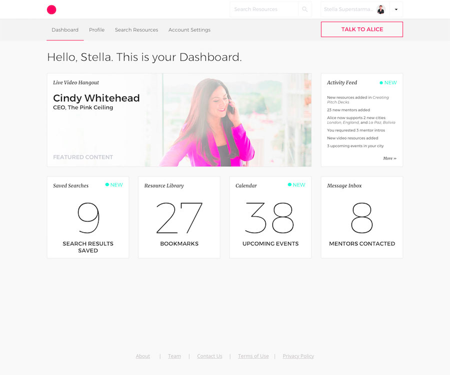 Καθοδηγούμενη από data analytics, η Alice είναι μια εικονική βοηθός, η οποία συνδέει τις γυναίκες επιχειρηματίες σε πραγματικό χρόνο, με πόρους που χρειάζονται για την κλιμάκωση των επιχειρήσεών τους και βασίζονται στο περιβάλλον, την τοποθεσία, τον κλάδο, τα έσοδα και τις ιδιαίτερες ανάγκες τους. Καθώς η Alice συλλέγει πληροφορίες, η μηχανική μάθηση της επιτρέπει να προβλέπει τις ανάγκες της ιδρύτριας και να καθοδηγήσει σε σχετιζόμενες πληροφορίες, εκδηλώσεις, μέντορες και σημεία πρόσβασης σε κεφάλαιο και επιχειρησιακά οικοσυστήματα.