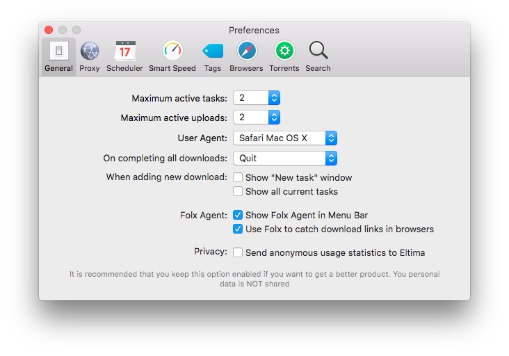 - Ταχύτερες λήψεις. Κάθε φορά που κατεβάζετε κάτι, το Folx χωρίζει τη λήψη σε έως 20 τμήματα και έτσι επιτυγχάνεται καλύτερη ταχύτητα λήψης. Αυτό μπορεί να μην δουλεύει σε ορισμένα sites για λόγους ασφαλείας, επομένως θα έχετε την απλή ταχύτητα όπως όλοι οι άλλοι, αλλά θα επωφεληθείτε από αυτό σε μεγάλα αρχεία.