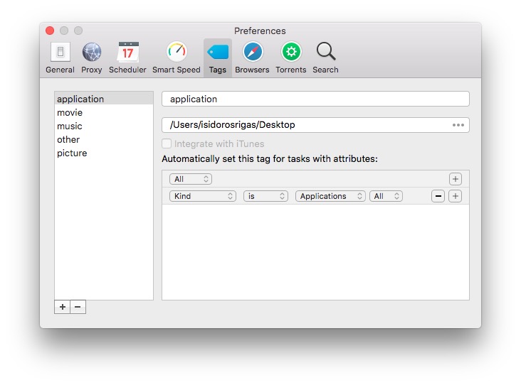 - Σύστημα ετικετών. Ό,τι κατεβάζετε παίρνει μια ετικέτα για εύκολη εύρεση. Για παράδειγμα, άμα κατεβάζετε μια ταινία, θα παίρνει την ετικέτα «Ταινία,» ή αν κατεβάζετε πρόγραμμα θα παίρνει την ετικέτα «Εφαρμογή.» Μπορείτε να διαχειριστείτε τις ετικέτες και να προσθέσετε ή να αφαιρέσετε μία. Ουσιαστικά δουλεύει αναλύοντας την επέκταση του αρχείου (π.χ. όλα όσα είναι .mp3 παίρνουν την ετικέτα «Μουσική»).