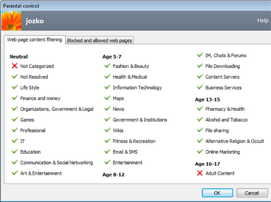 - Γονικός Έλεγχος: Φροντίζει για την ασφαλή περιήγηση των παιδιών στο internet απαγορεύοντας την πρόσβαση σε συγκεκριμένες ιστοσελίδες, αφού έχουν κατηγοριοποιηθεί βάσει καταλληλότητας ανάλογα με την ηλικία.