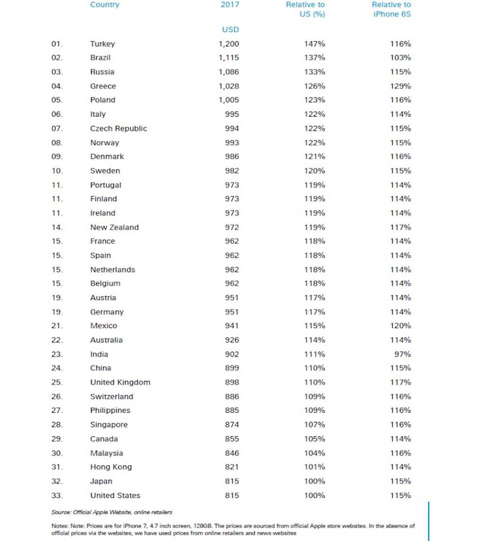 Apple iPhone 7 128GB costs Deutsche Bank Mapping the World’s Prices