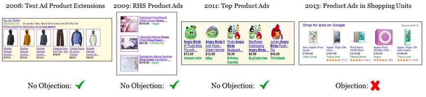 Πιστεύουμε ότι τα υπάρχοντα αποτελέσματα αγορών που παρέχουμε είναι χρήσιμα και αποτελούν μια πολύ βελτιωμένη έκδοση των παλαιότερων διαφημίσεων που εμφανίζαμε μια δεκαετία πριν οι οποίες περιείχαν μόνο κείμενο. Το να εμφανίζουμε διαφημίσεις που περιέχουν εικόνες, αξιολογήσεις και τιμές ωφελεί εμάς, τους διαφημιζόμενους μας και πάνω απ’ όλα τους χρήστες μας. Και τις εμφανίζουμε μόνο όταν τα σχόλια σας μας υποδεικνύουν ότι είναι σχετικές. Χιλιάδες Ευρωπαίοι έμποροι χρησιμοποιούν αυτές τις διαφημίσεις για να ανταγωνιστούν με μεγαλύτερες εταιρείες όπως το Amazon και το eBay.
