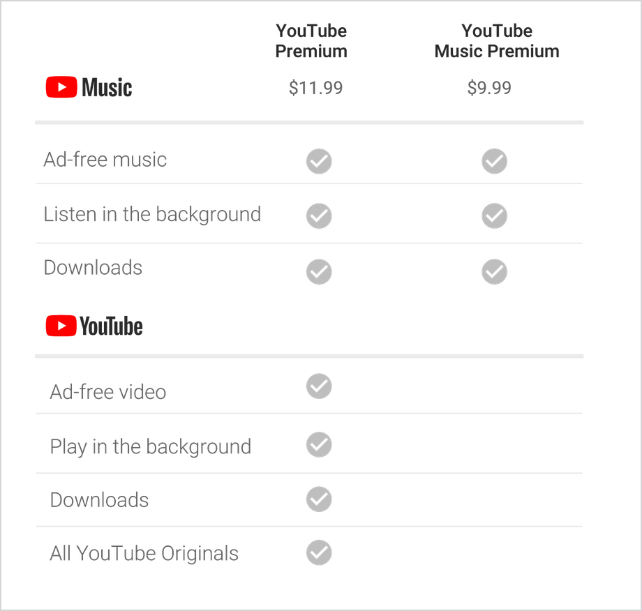 Η δωρεάν έκδοση του YouTube Music περιλαμβάνει διαφημίσεις, ενώ η επί πληρωμή έκδοση που κοστίζει $9.99/μήνα “σβήνει” τις διαφημίσεις και επιτρέπει στον χρήστη να κατεβάσει και να ακούσει τη μουσική στο παρασκήνιο, ενώ χρησιμοποιεί μια άλλη εφαρμογή. Οι συνδρομητές του Play Music θα αποκτήσουν πρόσβαση και στο YouTube Music Premium.