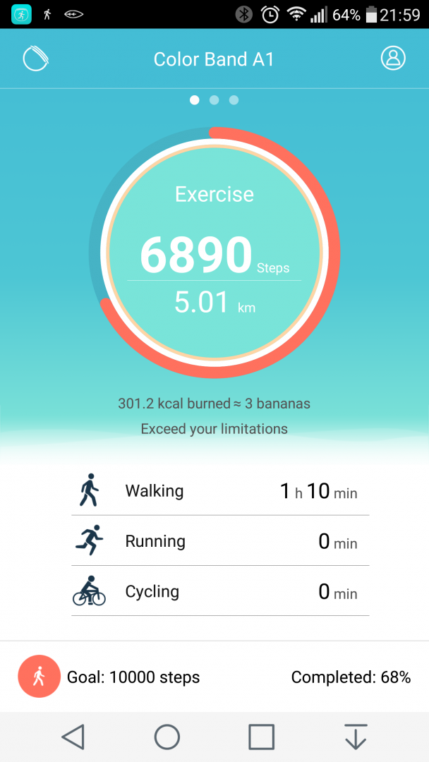 Το πρώτο και κυριότερο χαρακτηριστικό του Color Band A1 είναι η καταγραφή των φυσικών δραστηριοτήτων σας. Το βραχιόλι ανιχνεύει αυτόματα άμα περπατάτε, τρέχετε ή κάνετε ποδηλασία και καταγράφει πόσα βήματα κάνατε και πόσες θερμίδες καταφέρατε να κάψετε.