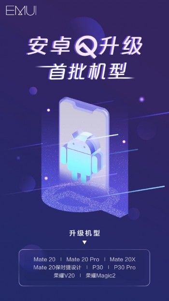 Όπως δήλωσε η Huawei στο κινέζικο κοινωνικό δίκτυο Weibo, τα ακόλουθα μοντέλα θα αναβαθμιστούν στο Android Q και τη νέα έκδοση του γραφικού περιβάλλοντος EMUI «αμέσως μόλις η Google κυκλοφορήσει την σταθερή έκδοση [του Android Q] για τα Pixel κινητά της».