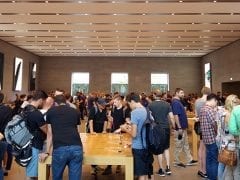 Όπως αναμενόταν, το κατάστημα ήταν γεμάτο με κόσμο που περίμενε να δει τα καινούργια προϊόντα της Apple και για αυτό το λόγο είχε σχηματιστεί μια μεγάλη ουρά Γερμανών έξω από το κατάστημα που ήθελαν να δουν ή να αγοράσουν τα καινούργια iPhone ή/και Watch.