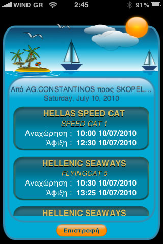 Η εφαρμογή “iSlands” διατίθεται δωρεάν [download link] και μέσω αυτής μπορείτε να επιλέξετε λιμάνι αναχώρησης και προορισμό (είναι καταχωρημένα όλα τα ελληνικά λιμάνια), ημερομηνία αναχώρησης και επιστροφής (αν θέλετε να δείτε και δρομολόγια επιστροφής) και με ένα κλικ έχετε στην οθόνη του iPhone σας όλα τα διαθέσιμα δρομολόγια, με τις ώρες αναχώρησης και άφιξης, τα οποία “σερβίρονται” με τη βοήθεια του ForthCRS.