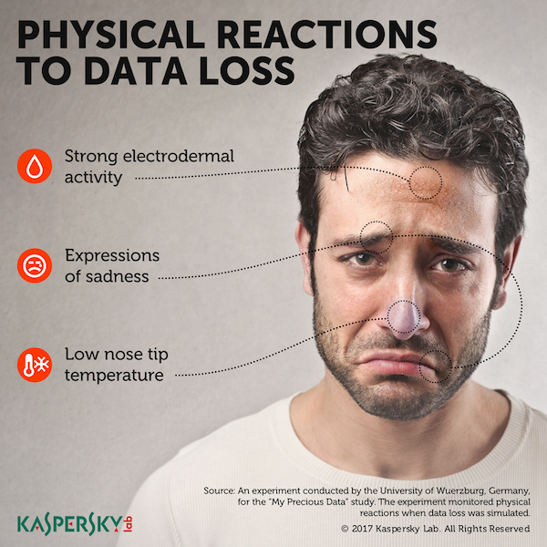 Στο πλαίσιο της έρευνας, η Kaspersky Lab συνεργάστηκε με ψυχολόγους από το Πανεπιστήμιο του Wuerzburg για να μετρήσει τις σωματικές αντιδράσεις των ανθρώπων στην απώλεια δεδομένων μέσα από μια σειρά τριών πειραμάτων. Ενώ οι ψυχολόγοι ανέμεναν να συναντήσουν πολύ ισχυρότερες αντιδράσεις στην απώλεια σημαντικών δεδομένων, εκπλήσσονταν ότι οι συμμετέχοντες έδειχναν σημάδια δυσφορίας ακόμα και στην απώλεια σχεδόν ασήμαντων για τους ίδιους δεδομένων.