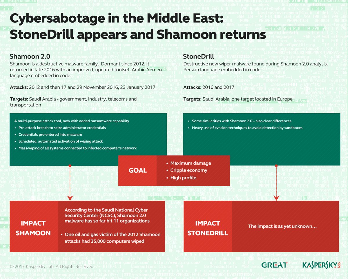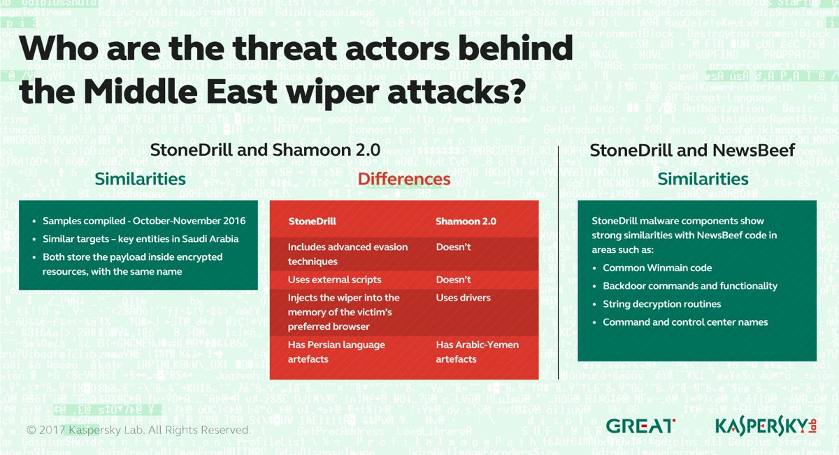 «Το ενδιαφέρον μας για τις ομοιότητες και τις συγκρίσεις μεταξύ αυτών των τριών κακόβουλων δραστηριοτήτων ήταν πολύ μεγάλο. Ήταν το StoneDrill ακόμα ένα κακόβουλο πρόγραμμα που διαγράφει αρχεία ανεπτυγμένο από τον παράγοντα Shamoon; Ή οι StoneDrill και Shamoon είναι δύο διαφορετικές και ασύνδετες ομάδες που απλά έτυχε να στοχεύουν οργανισμούς στη Σαουδική Αραβία την ίδια στιγμή; Ή, δύο ομάδες οι οποίες είναι ξεχωριστές αλλά ευθυγραμμίζονται όσον αφορά στους στόχους τους; Η τελευταία θεωρία είναι η πιο πιθανή: αναφορικά με τα ευρήματα μπορούμε να πούμε ότι, ενώ το Shamoon ενσωματώνει γλωσσικά τμήματα από Αραβικούς πόρους, καθώς και πόρους από την Υεμένη, το StoneDrill ενσωματώνει κυρίως γλωσσικά τμήματα πόρων Περσικής προέλευσης. Οι γεωπολιτικοί αναλυτές πιθανότατα θα επισήμαναν γρήγορα ότι τόσο το Ιράν όσο και η Υεμένη είναι παίκτες στον « πόλεμο μέσω αντιπροσώπων» ανάμεσα στο Ιράν και τη Σαουδική Αραβία, και η Σαουδική Αραβία είναι η χώρα όπου βρέθηκαν τα περισσότερα θύματα των πράξεων αυτών. Αλλά φυσικά, δεν αποκλείουμε την πιθανότητα αυτά τα ευρήματα να είναι “false flags”», δήλωσε ο David Emm, Senior Security Researcher της Kaspersky Lab.