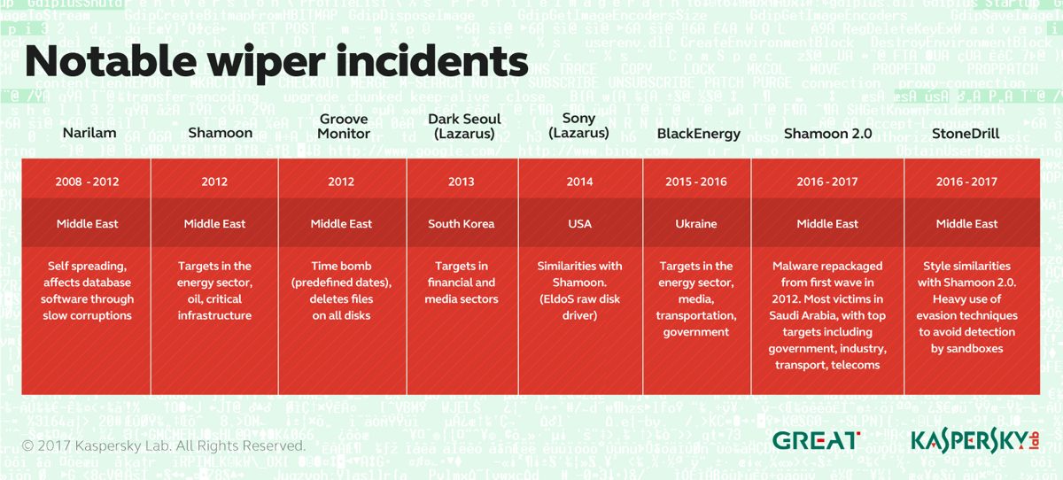 Το 2012, το wiper Shamoon (επίσης γνωστό και ως Disttrack) τράβηξε την προσοχή καταστρέφοντας περίπου 35.000 υπολογιστές σε μια εταιρεία πετρελαίου και φυσικού αερίου στη Μέση Ανατολή. Αυτή η καταστροφική επίθεση άφησε το 10% των προμηθειών πετρελαίου παγκοσμίως σε δυνητικό κίνδυνο. Ωστόσο, το περιστατικό ήταν μοναδικό στο είδος του, και μετά από αυτό ο φορέας έπαψε τη λειτουργία του. Στα τέλη του 2016, επέστρεψε με τη μορφή Shamoon 2.0 – μια αρκετά πιο εκτεταμένη κακόβουλη εκστρατεία που χρησιμοποιεί μια «βαρέως» ενημερωμένη έκδοση του κακόβουλου λογισμικού από το 2012.
