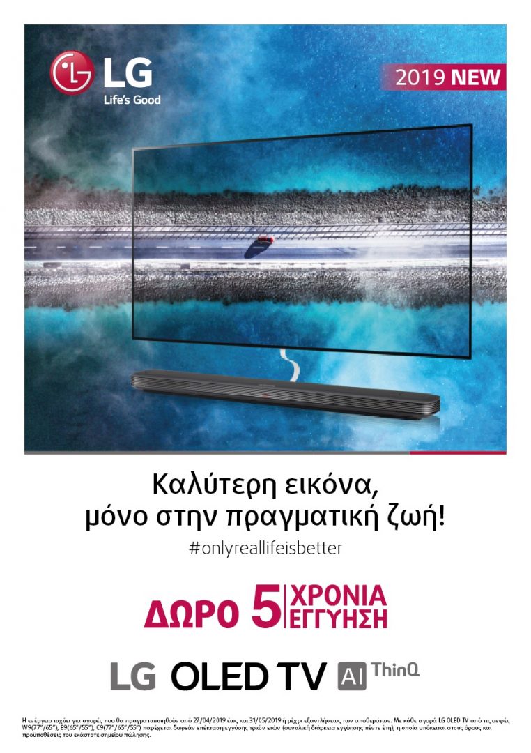Η LG Electronics (LG) ανταμείβει την επιλογή των καταναλωτών και τους προσφέρει δωρεάν επέκταση εγγύησης τριών ετών, με την αγορά μιας premium LG OLED AI ThinQ τηλεόρασης, από τις σειρές W9 (στις 77 και 65 ίντσες), E9 (στις 65 και 55 ίντσες) και της C9 (στις 77, 65 και 55 ίντσες). Πιο αναλυτικά, για αγορές που θα πραγματοποιηθούν από 27/04/2019 έως και 31/05/2019 ή μέχρι εξαντλήσεως των αποθεμάτων η εγγύηση από την LG μπορεί να φτάσει τα πέντε χρόνια!