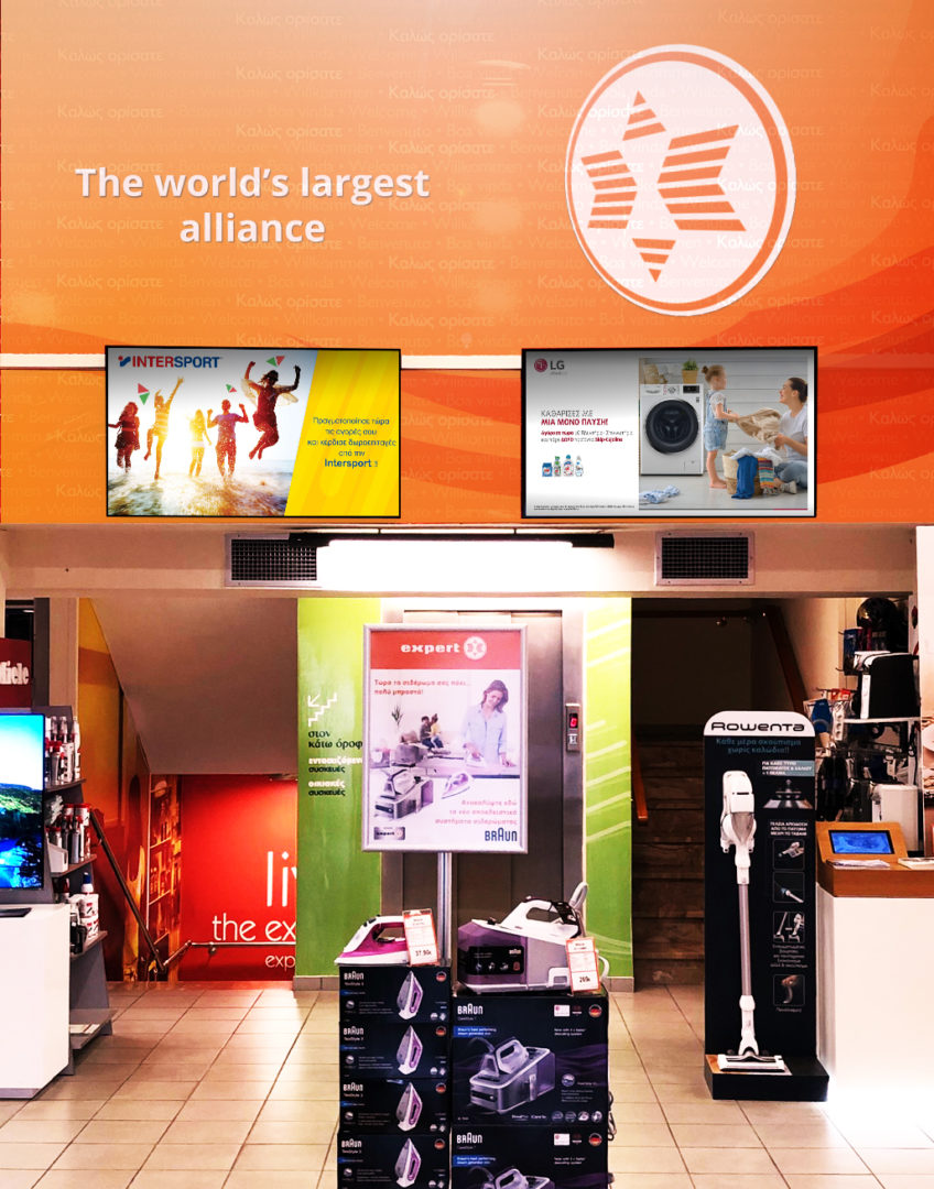 Συγκεκριμένα, επιλέχθηκαν digital signage WebOS monitors της σειράς 55SM5KE για το εσωτερικό των καταστημάτων  και  digital signage monitors υψηλής φωτεινότητας (2.500nits) 55XS2E για βιτρίνες, εξασφαλίζοντας εκπληκτική απόδοση καθ’ όλη τη διάρκεια της ημέρας. Χάρη στο ολοκληρωμένο σύστημα διαχείρισης περιεχομένου, το μοντέλο SM5KE επιτρέπει στο χρήστη να επεξεργάζεται και να αναπαράγει περιεχόμενο, να δημιουργεί λίστες αναπαραγωγής χωρίς ξεχωριστό υπολογιστή, και να διαχειρίζεται τη σήμανση απλά και αποτελεσματικά μέσα από μια ολοκληρωμένη λύση, ενώ ταυτόχρονα προσφέρει αδιάλειπτη και ομαλή αναπαραγωγή περιεχομένου. Επιπλέον, η εταιρεία Expert Hellas επέλεξε το Supersign CMS Software της LG προκειμένου να διαχειρίζεται κεντρικά με απομακρυσμένη διαχείριση το digital signage network που δημιούργησε.
