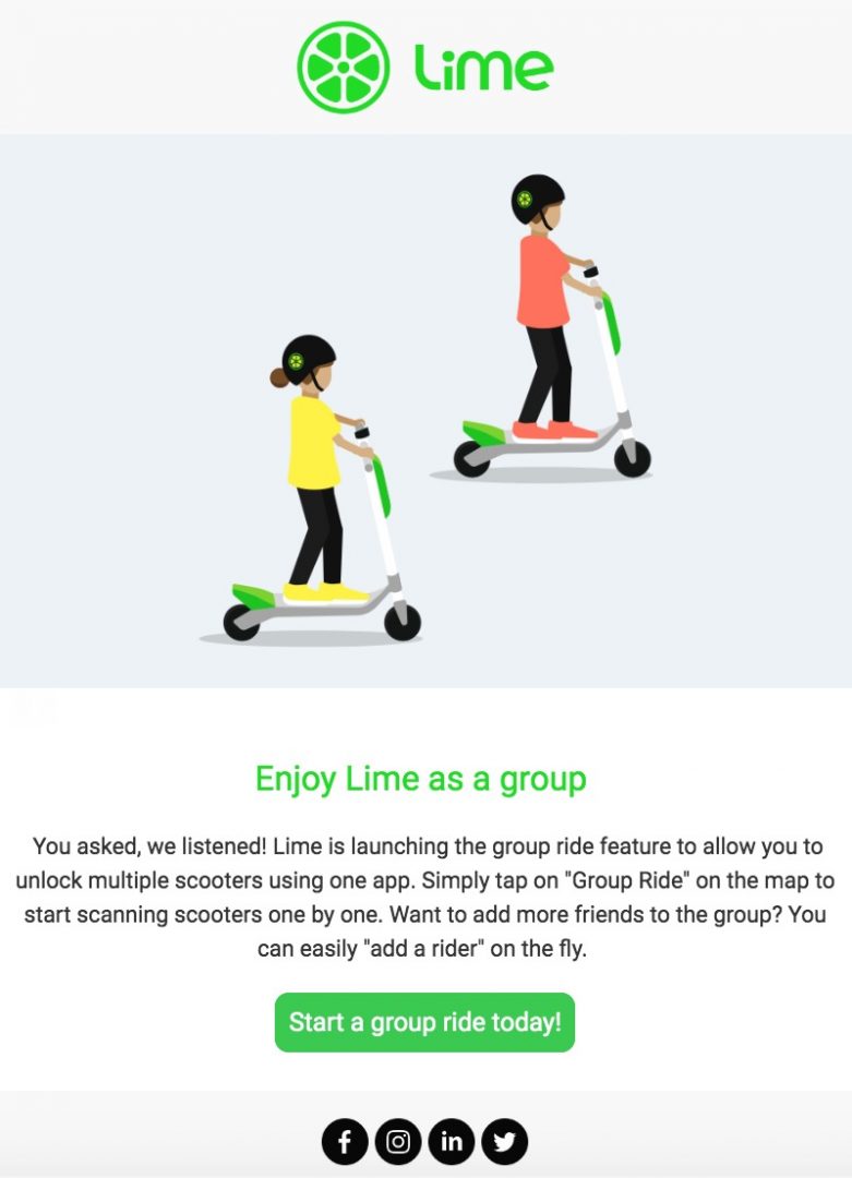 Το Group Ride επιτρέπει στους χρήστες να ξεκλειδώνουν έως και πέντε ηλεκτρικά πατίνια από τον ίδιο λογαριασμό. Απλά πατούν στο εικονίδιο “Group Ride” που βρίσκεται ακριβώς πάνω από το εικονίδιο “Scan To Ride” στην εφαρμογή της Lime και ξεκινούν. Mπορείτε να καλέσετε τους φίλους να σας ακολουθήσουν ακόμα και αν η πορεία σας με το ηλεκτρικό πατίνι έχει ήδη ξεκινήσει.
