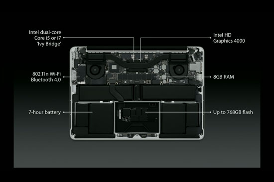 Το νέο υπερφορητό της Apple διαθέτει επεξεργαστή Intel Core i5 (Ivy Bridge) χρονισμένο στο 2.5GHz, κάρτα γραφικών Intel HD 4000, 768GB SSD και 8GB Ram, ενώ η μπαταρία του μπορεί να το «κρατήσει ζωντανό» 7 ώρες.