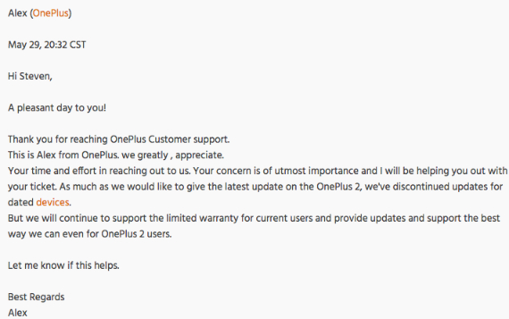 Όπως επιβεβαίωσε η OnePlus, επειδή το OnePlus 2 είναι ένα παλιό κινητό, θα προσφέρει μονάχα ενημερώσεις λογισμικού (π.χ. για διορθώσεις κενών ασφαλείας) και όχι αναβαθμίσεις σε νεότερες εκδόσεις του Android. Αυτό σημαίνει ότι δεν θα λάβει ποτέ το Android 7.0 Nougat… τουλάχιστον επίσημα.
