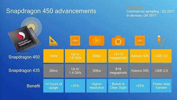 Το Snapdragon 450 είναι το πρώτο μεσαίας κατηγορίας chip το οποίο κατασκευάζεται με τη διαδικασία FinFET σε κλίμακα 14nm. Αποτελεί τον διάδοχο του Snapdragon 435 και φέρνει 25% βελτίωση στην ταχύτητα του επεξεργαστή (CPU) και της μονάδας γραφικών (GPU), τουλάχιστον 4 ώρες μεγαλύτερη αυτονομία με την ίδια μπαταρία και τον ίδιο χρόνο φόρτισης, και 30% μεγαλύτερη εξοικονόμηση ενέργειας όταν ο χρήστης παίζει παιχνίδια.