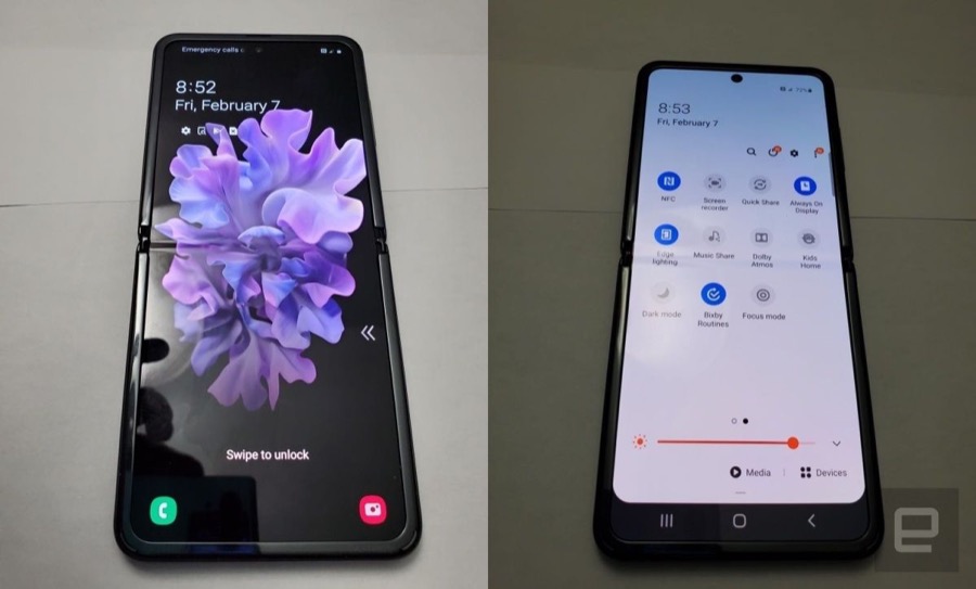 Αν και μέχρι σήμερα είχαμε δει renders και ένα πολύ σύντομο βίντεο, οι νέες φωτογραφίες δείχνουν ξεκάθαρα πως είναι το Samsung Galaxy Z Flip κλειστό και ανοιχτό. Όταν είναι κλειστό μπορείτε να δείτε τη διπλή κάμερα που προεξέχει ελάχιστα, δίπλα στην εξωτερική οθόνη για την ώρα και τις ειδοποιήσεις.