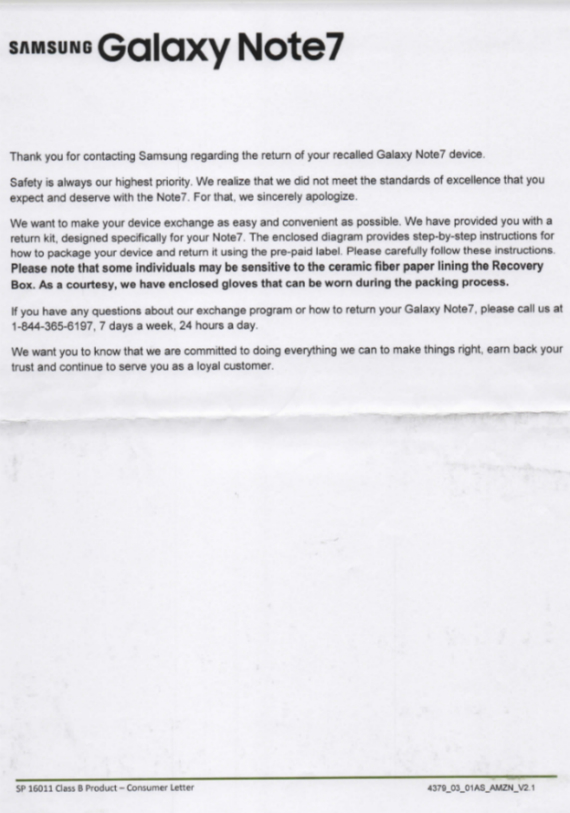 Τέλος, με το ίδιο κιτ η Samsung στέλνει και ένα γράμμα στο οποίο απολογείται για το σφάλμα της.