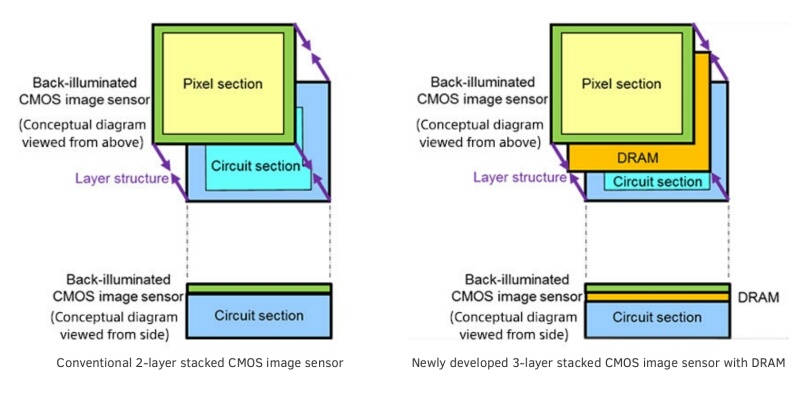 Η Sony κατάφερε να χωρέσει τη μνήμη DRAM ενδιάμεσα από το πλέγμα BSI (BackSide Illuminated) των pixels και του κυκλώματος που επεξεργάζεται το σήμα. Σύμφωνα με την εταιρία, η μνήμη μπορεί να διαβάσει ταχύτατα την εισερχόμενη πληροφορία (δηλαδή την εικόνα που καταγράφεται) και στη συνέχεια την στέλνει στον επεξεργαστή εικόνας.