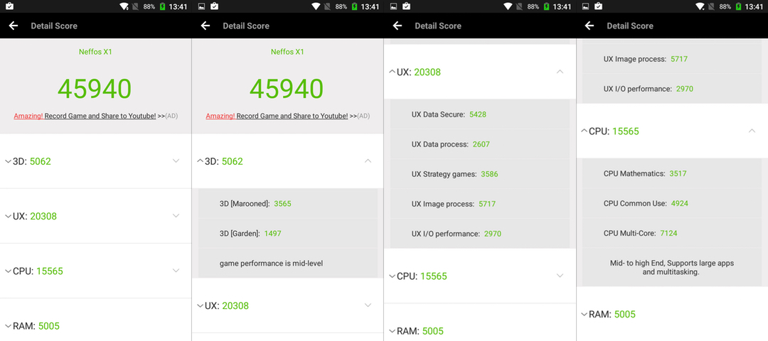 Στο AnTuTu, ένα πρόγραμμα μέτρησης των επιδόσεων ενός κινητού, το Neffos X1 τα πήγε καλά. Βρίσκεται στην 51η θέση με βαθμό 45,940, 19 θέσεις κάτω από το Galaxy S7 Edge (133,241) και άλλες ναυαρχίδες ή ακριβότερα κινητά.