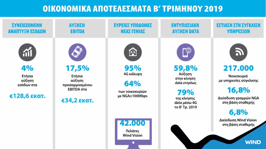 Οικονομικά αποτελέσματα Β’ Τριμήνου 2019 ανακοινώνει σήμερα η WIND Ελλάς, καταγράφοντας για ακόμα μία φορά αύξηση εσόδων και ανάπτυξη πελατειακής βάσης σε όλους τους τομείς υπηρεσιών τόσο στους ιδιώτες όσο και στις επιχειρήσεις.