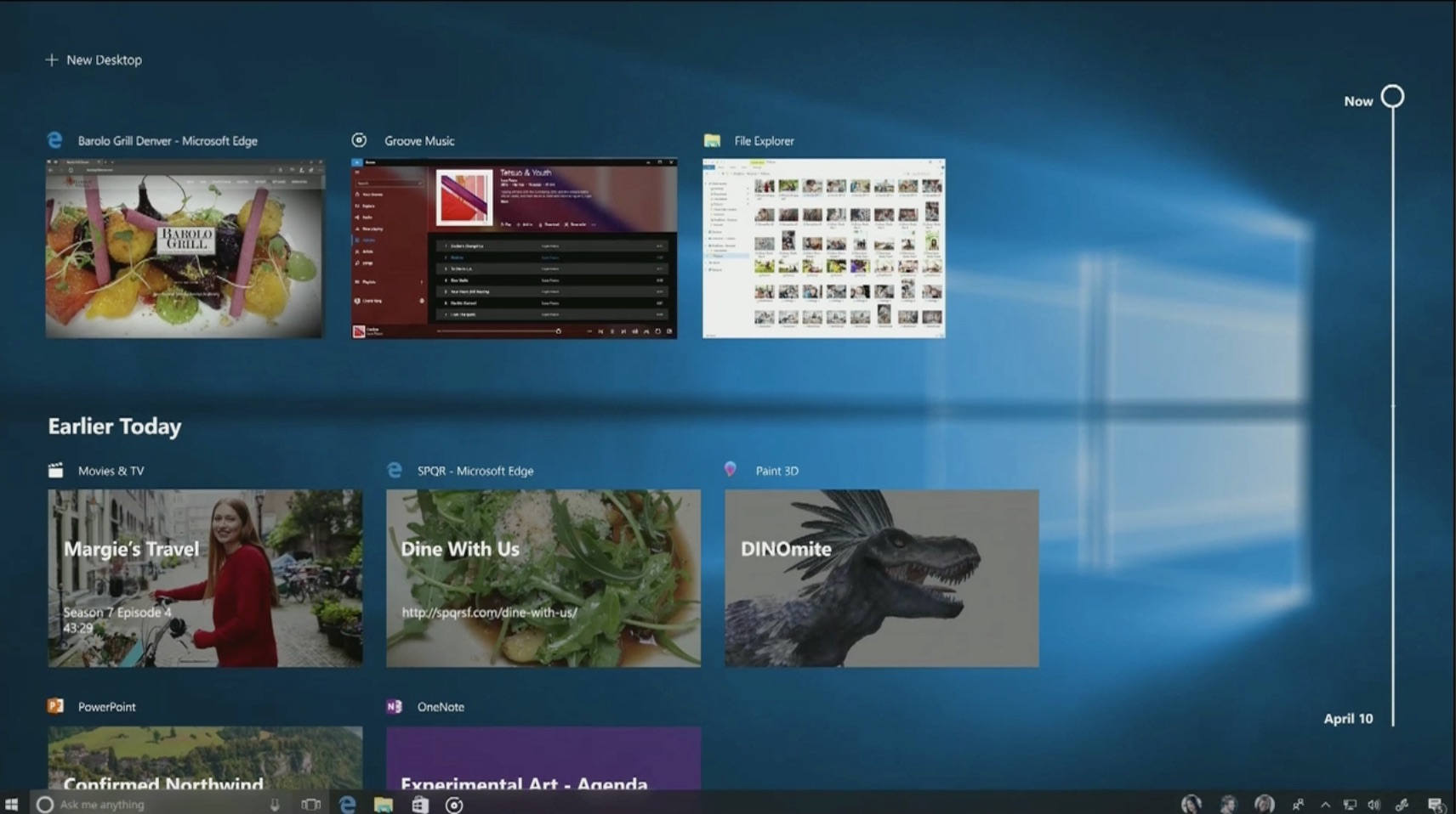 3. Με το νέο Timeline μπορείτε να πάτε πίσω στον χρόνο και να συνεχίσετε μία δραστηριότητα από εκεί που σταματήσετε. Για παράδειγμα, άμα χθες κλείσατε τον υπολογιστή σας ενώ σερφάρατε στο Διαδίκτυο με 15 καρτέλες ανοιχτές, θα μπορείτε να ανοίξετε το Timeline, να πάτε στη χθεσινή ημερομηνία και να πατήσετε τον browser για να συνεχίσετε το σερφάρισμα από εκεί που σταματήσατε. Το Timeline υποστηρίζει εφαρμογές, αρχεία και websites και διαθέτει δυνατότητα αναζήτησης. Τέλος, άμα έχετε τα αρχεία σας στο OneDrive θα μπορείτε να συνεχίσετε τη δουλειά σας από το ένα PC στο άλλο, ή από το PC στο smartphone σας ακόμα και αν δεν έχετε στην δεύτερη συσκευή τα απαραίτητα αρχεία (θα τα φορτώσει η Cortana από το OneDrive).